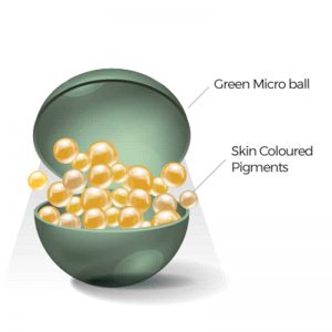 - groene microcapsule (de capsules zijn van suiker gemaakt, niet van plastic) met huidkleurige pigmenten (groen neutraliseert rood)